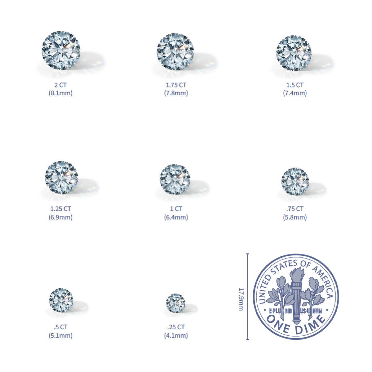 Carat is a measurement of the weight of the diamond with one carat equally 0.2 grams. This diagram gives a general indication of size for a round diamond, but the actual size will vary by shape (cushion, emerald, marquise, oval, princess, pear, radiant, round, heart) and the depth of the stone.