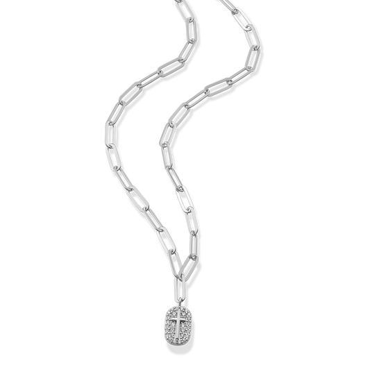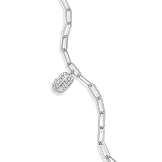 A classic paperclip bracelet showcasing a cross pendant with sparkling lab-created diamonds set in rhodium-plated sterling silver. This design exudes everyday sophistication and timeless elegance.
