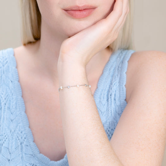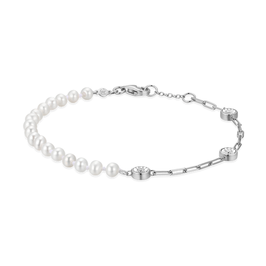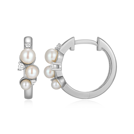 A classic design showcasing a genuine white pearl accented with sparkling lab-created diamond clusters crafted in rhodium-plated sterling silver. This piece exudes everyday elegance, making it a versatile addition to any wardrobe.