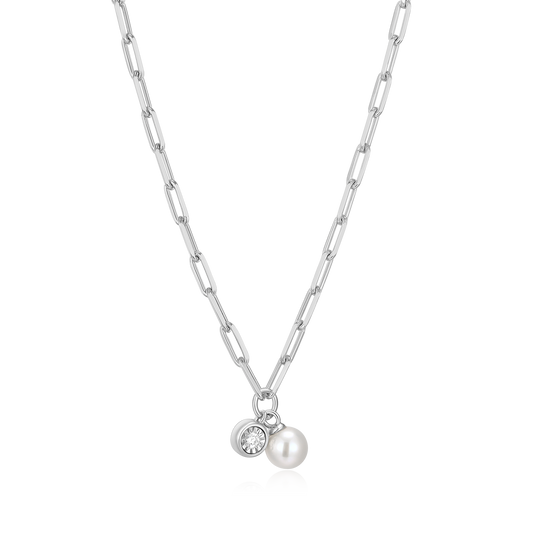 BN0226W - June Birthstone Freshwater Pearl & Lab-Created Diamond Mini Paperclip Necklace